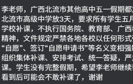 广西北流高中顶风作案!学生控诉:五一补课“自愿书”实为强制,教育局装瞎?