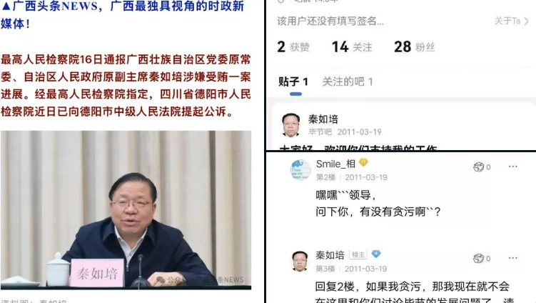 根据网传资料,早在2011年,秦如培在其社交平台上的贴吧头像与用户名显示了其身份。当时,秦如培担任贵州省毕节地委书记。在该平台上,秦如培曾公开回应网友提问,并表示:“欢迎大家可以随便提问”。在一名网友质疑他是否存在贪污行为时,秦如培回复道:“如果我贪污,那我现在就不会在这里和你们讨论毕节的发展问题了。”
