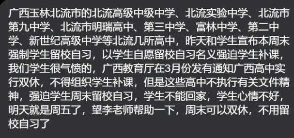 广西教育厅此前已明确规定,全区普通高中须全面落实双休日制度,不得组织任何形式的周末补课或强制性留校行为。然而,这一文件在北流多所学校形同虚设,严重违背政策精神。