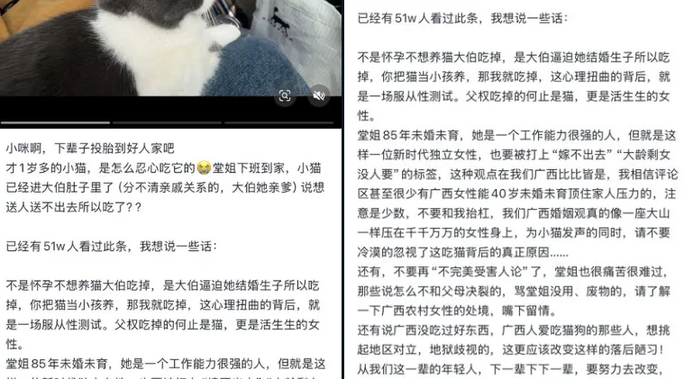 唐人日报2月6日讯:近日,广西一名女子发文称,自己的85年出生的堂姐未婚未育,因其父亲无法接受她将猫视为孩子养,于是采取极端措施逼迫她结婚生子。女子表示,堂姐的父亲为迫使其改变生活方式,竟将她一岁多的猫宰杀并食用。
