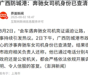 8月2日,防城港市政府相关负责人回应称,奔驰女司机的身份已经查清,目前事件调查工作正在推进中,相关结果将“统一对外发布”。然而,这一表态并未明确公布当事人身份,只强调结果会在适当时机发布,引发了更多网友质疑。