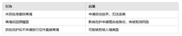 若未经批准离境,庇护申请会被视为自动放弃,且入境美国可能被拒绝。