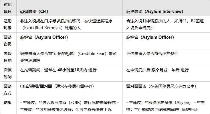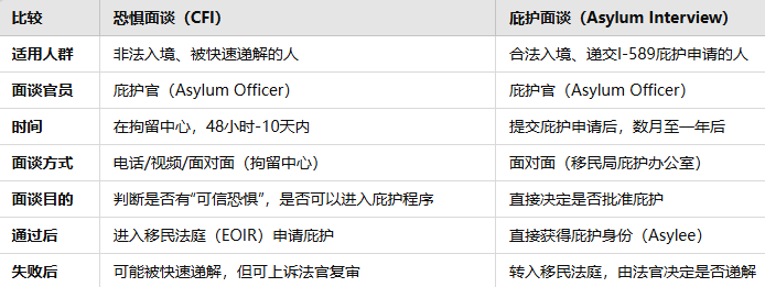 庇护面谈(Asylum Interview) 和 恐惧面谈(Credible Fear Interview, CFI) 不是同一个概念,尽管它们都涉及庇护申请。它们适用于不同的情况,且目的和流程也不同。下面详细介绍两者的区别: