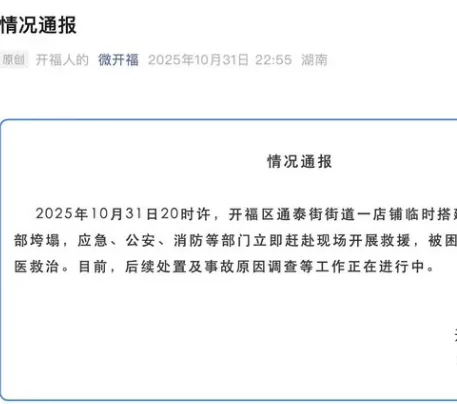 据开福区应急管理局通报,事故发生在当晚20时许,事发地点为通泰街街道一处商铺外的装修施工现场。目击者称,当时施工人员正在进行夜间作业,突然传出“咔嚓”声,伴随一阵巨响,脚手架钢管和木板瞬间坠落,多名人员被压在下方。