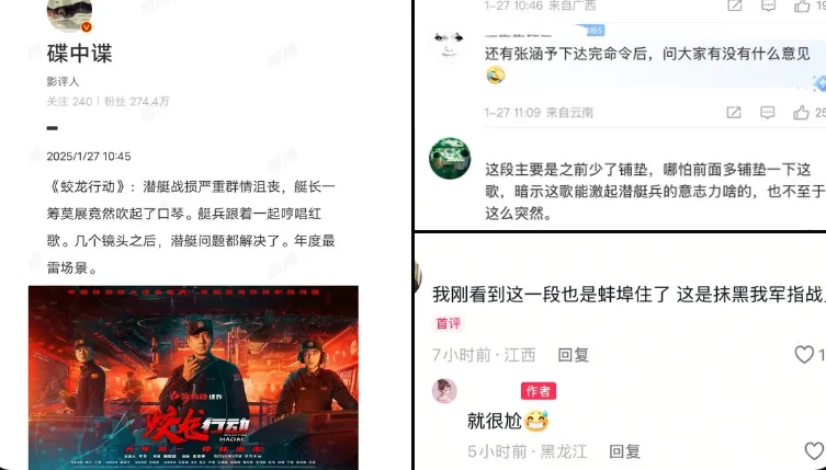唐人日报1月29日讯:近日,一名影评人在观看电影《蛟龙行动》后发文评论,指出影片中的一场潜艇遭遇重大损失、局势严重时,指挥官情势危急,却突然吹起口琴,士兵们随之哼唱红歌,几镜头后潜艇的问题便轻松解决,直言该场景为“年度最雷场景”。
