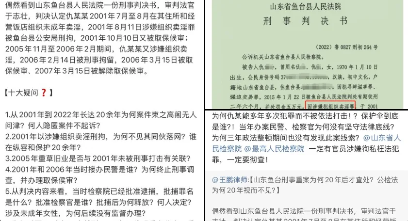唐人日报2月14日讯:近日,律师王鹏公开质疑山东鱼台县法院一宗未成年人卖淫案件。王鹏称,发现一份2001年仇某某涉嫌组织未成年人卖淫的刑事判决书,仇某某在被公安刑拘后被取保候审,2005年再次涉嫌类似犯罪。然而,这一案件直到现在仍未得到有效处理。