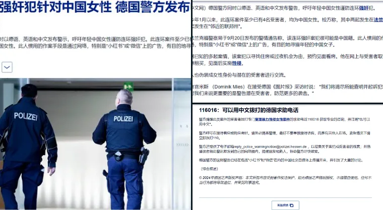 唐人日报11月17日讯:近日,德国多地接连发生强奸案,法兰克警方称,该连环案犯可能是中国籍,此人惯用手段是通过小红书或微信上的广告,以寻找住房为由,预约见面看房,并在见面后实施性侵。德国警方同时以德语、中文和英语发布警示,呼吁年轻中国女性谨防连环强奸犯。