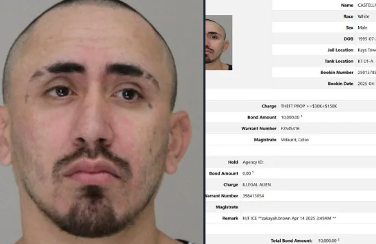 唐人日报4月27日讯:德克萨斯州达拉斯县执法部门通报,非法移民加布里埃尔·卡斯特拉诺·佩雷斯(Gabriel Castellano Perez)因涉嫌盗窃价值3万至15万美元的财产被逮捕,目前已被移民与海关执法局(ICE)拘留。