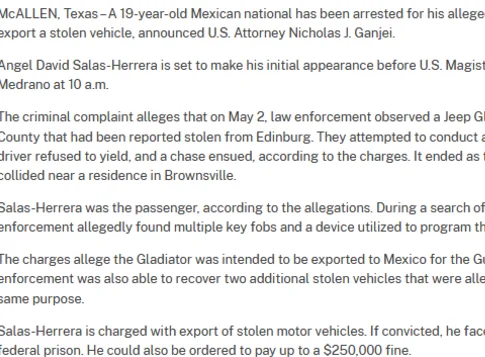 唐人日报5月12日讯:德克萨斯州卡梅伦县执法部门近日逮捕了一名非法移民安吉尔·大卫·萨拉斯-埃雷拉(Angel David Salas-Herrera),他被控参与将被盗机动车出口至境外,涉嫌为墨西哥臭名昭著的海湾贩毒集团工作。