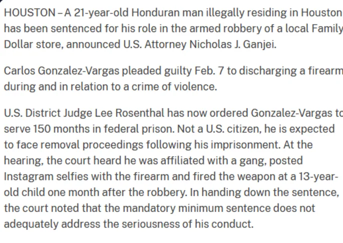 唐人日报4月30日讯:近日,一名非法入境的洪都拉斯籍男子卡洛斯·冈萨雷斯-巴尔加斯(Carlos Gonzalez-Vargas)在德州哈里斯县法院认罪,承认在一起暴力犯罪中开枪,并与帮派活动有关。