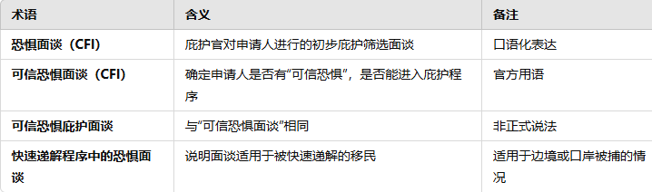 - 恐惧面谈 = 可信恐惧面谈(Credible Fear Interview, CFI),它们是同一个概念。