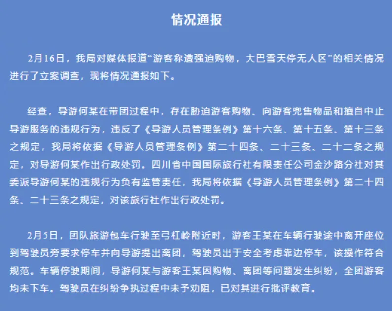 唐人日报3月2日讯:近日,成都市文旅局通过其微信公众号发布了对一起游客投诉强迫购物的调查通报。事件源于2月16日媒体报道,游客在旅行途中遭遇导游强迫购物,且大巴车在雪天无人区停车的情况。调查显示,涉事导游何某某在带团期间违反了《导游人员管理条例》多条规定,因此受到行政处罚。