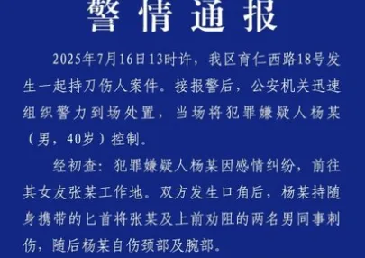 唐人日报7月18日讯:四川成都再次传出恶性伤人事件,引发社会关注。成都市公安局金牛区分局于当日发布警情通报,称当天下午13时许,辖区内发生一起因感情纠纷引发的持刀伤人案件,造成1人死亡、2人受伤,犯罪嫌疑人已被当场控制。