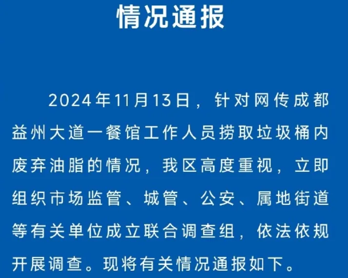 唐人日报11月14日讯:近日,成都高新区通报,益州大道“隆江猪脚饭”餐馆工作人员疑回收地沟油。经调查,店员倪某英从垃圾桶捞取废油,经过初步处理后储存待售。该店后厨未发现废油与烹饪油具混用。餐馆已停业配合调查,相关部门要求整改。高新区加强食品安全执法,严打“地沟油”等违法行为,保障餐饮消费安全。
