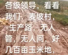 唐人日报10月14日讯:,山东省临沂市郯城县高峰头镇麦坡村,多名村民反映,村内一条主要生产路多年未硬化,遇雨成泥塘、晴天扬灰尘,出行极为不便。眼下正值玉米收割季,几百亩玉米成熟在地,却因车辆无法通行而被迫滞收。