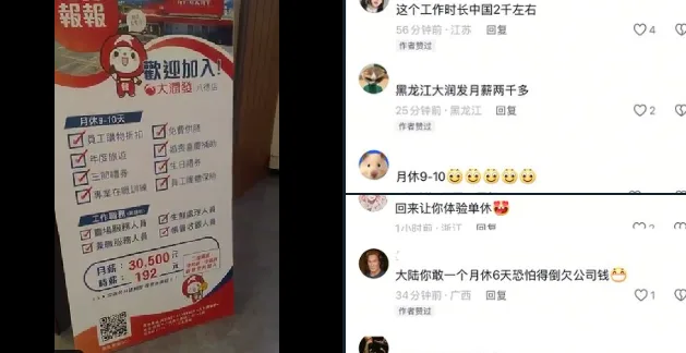 唐人日报4月14日讯:一张来自台湾大润发超市的招聘海报在大陆社交平台引发热议。海报显示,该超市提供月薪30,500新台币(约合人民币6,869元),时薪为192台币(约合43元),且月休9到10天。消息曝光后,大量中国网友表示“看傻了”,引发羡慕狂潮。