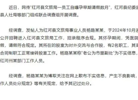 唐人日报7月11日讯:近日,一则“红河县文旅局女员工孕早期请假数月、工作甩给合同工、老公是副处”的网络贴文在社交平台引发轩然大波,舆论聚焦“体制内躺平”“编制优越感”现象。7月9日,红河县官方通报调查结果,确认涉事人杨路某某确系红河县文旅局事业编人员,其部分言论严重失实,已被依法处理。