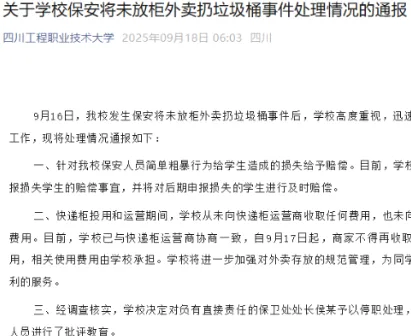 “扔外卖”风波处理结果出炉:四川工程职业技术大学赔偿学生,保卫处处长被停职
