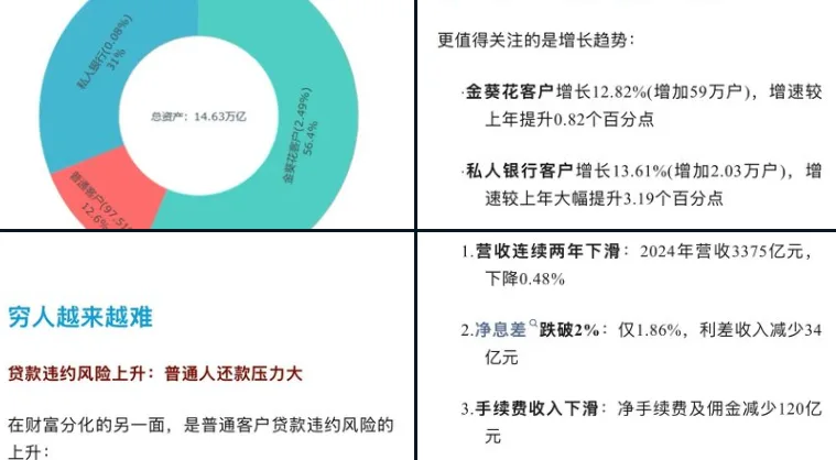 同时,报告中也提到了普通客户面临的财务压力。不良贷款总额达到918.75亿元,较去年增加了近100亿元。这一增长不仅反映了普通人偿债能力的压力,也间接体现了经济中较低收入群体的困境。