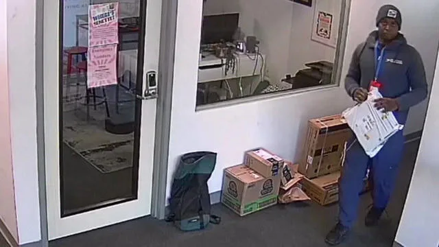 在监控视频中,他被看到检查多个包裹后打开其中一个,随后将至少两个包裹装入背包并离开。