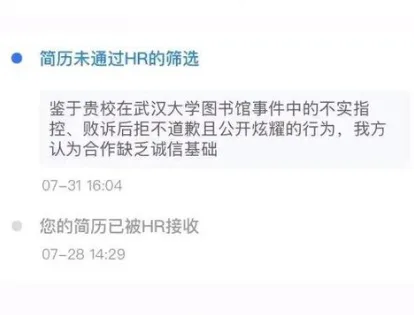 在各大社交平台上,有武汉大学在读生和毕业生表达了焦虑与不满。他们认为,事件已对学校形象造成伤害,而招聘歧视将直接影响学生实习与就业机会,进一步扩大了负面影响。“本来就业就不容易,现在连面试机会都被剥夺。”一名大四学生在匿名帖子中写道。