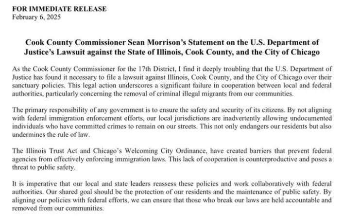 莫里森表示,将县财政资金用于库克县以外的法律事务是“不公平的”,并认为这超出了县政府的职责范围。他强调,公共资金应该优先用于库克县内部的居民和服务,而不应延伸至其他司法辖区。他的立场得到了部分保守派人士的支持,他们认为,库克县纳税人的钱不应被用于支持外部地区的移民辩护事务。