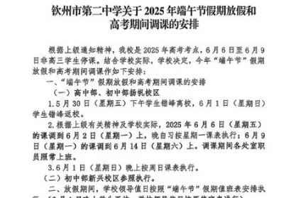 唐人日报6月5日讯:近日,广西钦州第二中学一名学生投稿曝光,学校以“高考放假”之名侵占国家法定端午节假期,引发学生不满。该学生指出,学校在实行双休制度的背景下,仍强制学生在周五晚间上晚自习,变相形成每周“六晚自习”的高压学习安排,严重透支学生精力。