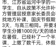 唐人日报10月11日讯:近日,江苏省邳州市运河中学被学生实名举报,称学校在“禁止校内补课”的政策下,以“家长自愿”的名义暗中组织校外集体补课,不仅国庆假期仅放三天,还强制要求学生分摊每天高达1000元的场地费用。消息曝光后,引发社会广泛关注与愤怒。