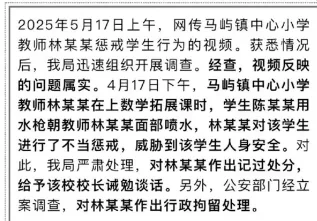 唐人日报5月20日讯:近日,浙江瑞安市马屿镇中心小学一名教师因涉嫌体罚并恐吓学生事件持续发酵。5月17日,涉事教师林元培在接受采访时回应称,事发当日男孩因未获糖果奖励,情绪激动,用水枪朝他脸部喷水。自己出于“教育”目的,便将孩子“抱起”,指着窗外对其说:“如果大家都像你这样,该怎么办?”