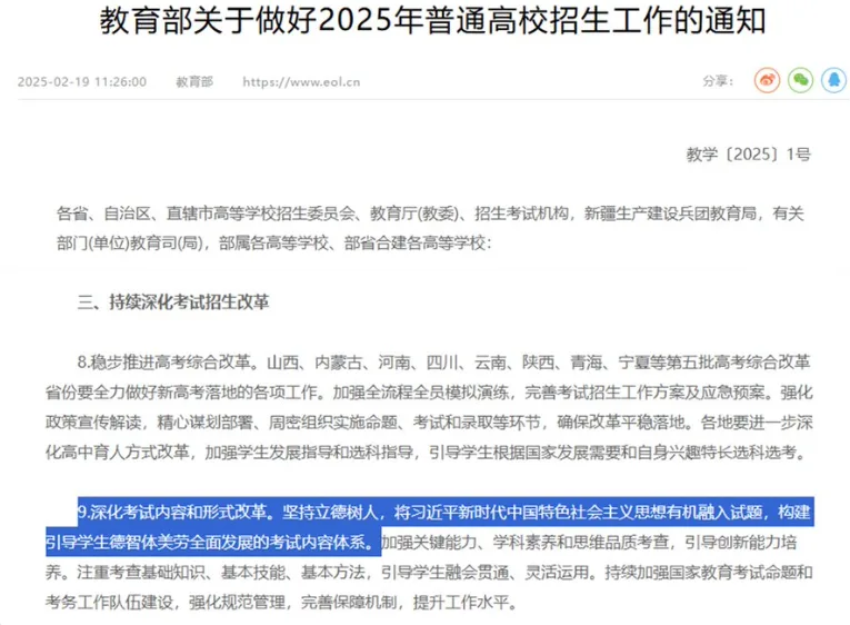 唐人日报2月20日讯:中国教育部近日发布通知,要求在各类考试中将习近平新时代中国特色社会主义思想有机融入试题,构建一个全面引导学生德智体美劳发展的考试内容体系。通知强调,要通过考试内容的创新,强化学生的思想政治教育,提升综合素质,推动全面发展。