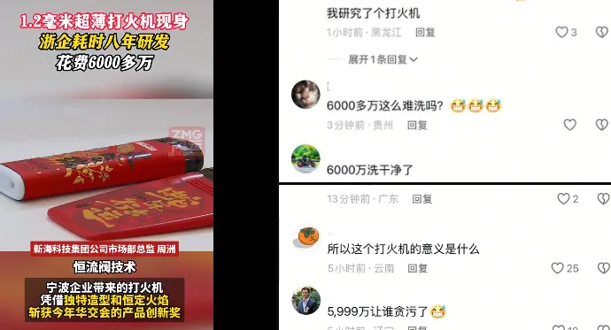 同时,也有网民对新海科技集团的巨额投资提出质疑,认为6000万元的资金用于研发一款打火机是否合理。有评论甚至戏谑这是一种“洗钱”的方式,质疑公司的资金使用效率和管理透明度。