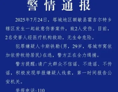 唐人日报7月30日讯:新疆裕民县公安局发布警情通报称,2025年7月24日,塔城地区额敏县霍吉尔特乡发生一起恶性故意伤害案件,造成两人受伤。目前,两名受害者经医疗机构全力救治,已无生命危险。