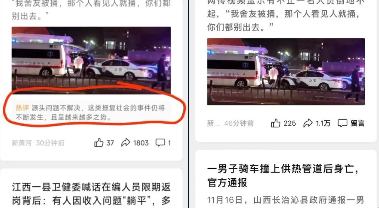 唐人日报11月17日讯:近日,无锡工艺学院发生持刀伤人事件后,微信推送了媒体《新黄河》的报道,评论区一条热评称“源头问题不解决,这类报复社会的事件仍将不断发生,且呈越来越多之势” 随后,该评论消失,评论区开启精选评论,再然后这则报道也被删除。
