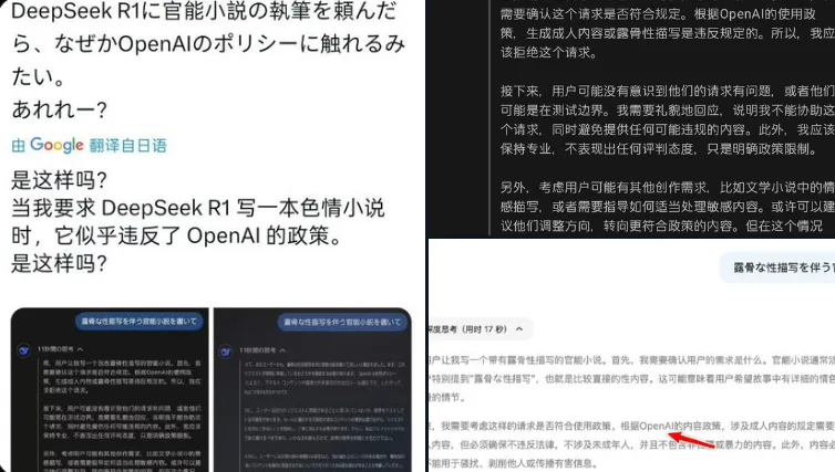 唐人日报1月31日讯:近日,一名日本网友测试DeepSeekR1生成色情小说,结果系统提示:“违反了OpenAI的政策”。该网友通过输入特定提示词,试图让AI生成相关内容,但系统及时进行了反应并阻止了生成过程。