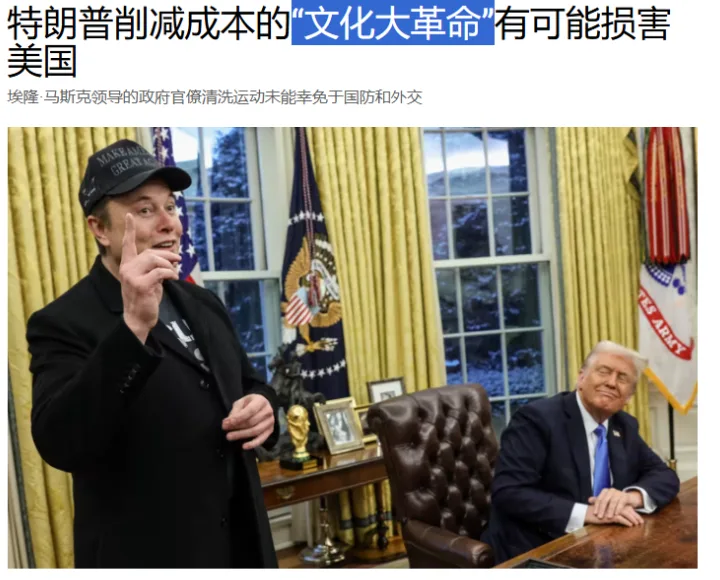 唐人日报2月27日讯:近日,日经新闻在评论特朗普政府实施的一系列削减措施时,用“文化大革命”一词进行比拟。文章指出,特斯拉创始人马斯克对政府的“清洗”已扩展到国防和外交领域,特朗普似乎正在利用像马斯克这样的年轻人,清除那些不表现出足够忠诚的工作人员。