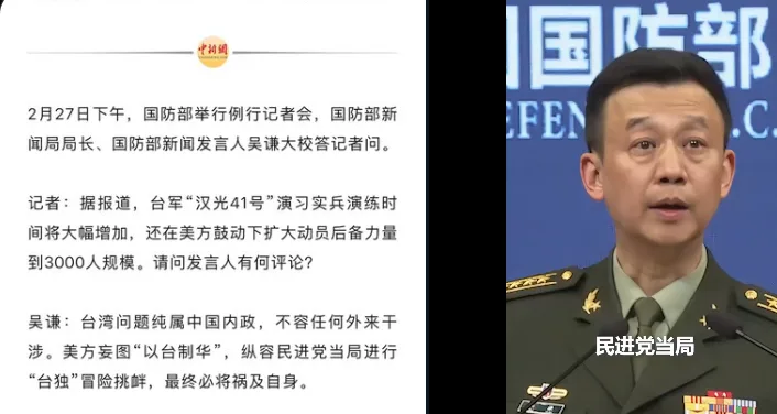 唐人日报2月28日讯:近日,中国国防部发言人吴谦对民进党当局发出严正警告,称“螳臂挡车只能自取灭亡,早晚要来收了你们。”吴谦表示,台湾问题是中国的内政,任何外部干涉和台独分裂行径都无法阻止中国统一的历史进程。