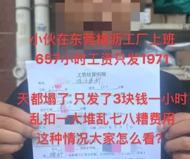 唐人日报8月11日讯:广东东莞横沥,一名工人的工资条在网络上引发舆论哗然——他在工厂辛苦工作了657小时,最终到手工资仅1971元,折算下来每小时不足3元。