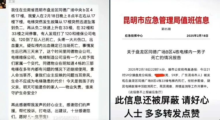 唐人日报2月22日讯:近日,云南省昆明市盘龙区同德广场B区4栋发生电梯故障事故,导致59岁业主韦某不幸身亡。据初步调查,电梯在维修过程中发生故障,首先从楼顶急速坠落至负二楼,随后猛冲至33楼。韦某在电梯内死亡。