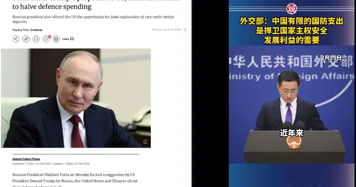 唐人日报2月26日讯:近日,俄罗斯总统普京表示支持特朗普关于将俄罗斯、美国、中国的军费预算分别减半的提议。普京指出:“我认为削减军费是个好主意,美国削50%,我们也削50%。要是中国愿意的话也可以加入。”对此,中国外交部回应称:“中国有限的国防支出完全是捍卫国家主权安全发展利益的需要,是维护世界和平的需要。”