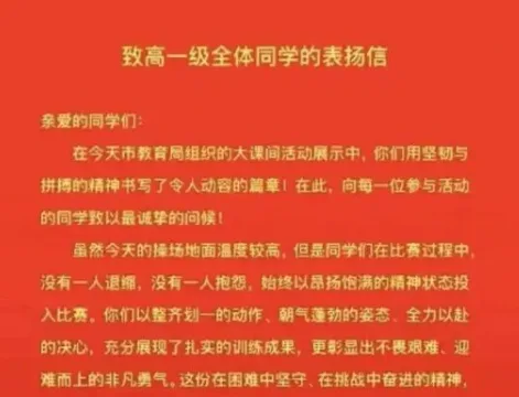 据家长和学生反映,至少9名高一学生出现明显烫伤症状。然而,学校在事发后不仅未及时将受伤学生送医处理,反而向高一学生集体发放“表扬信”,称“在比赛过程中没有一人退缩,彰显了迎难而上的勇气”。