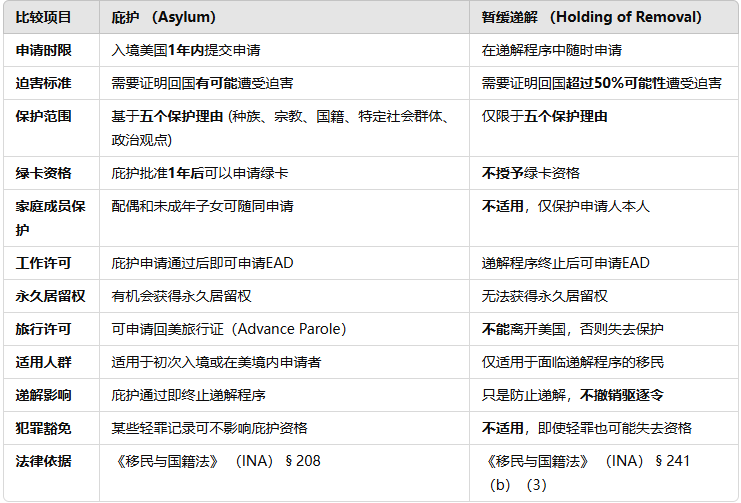 暂缓递解(Withholding of Removal)和庇护(Asylum)虽然都能保护申请人免于被递解出境,但它们在申请条件、权益、法律后果等方面存在显著差异。以下是详细的对比分析: