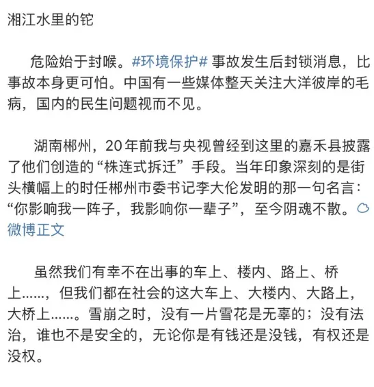 王才亮强调,信息的透明度是公共安全和法治的基石。在耒水流域的铊污染事件中,相关部门最初尝试封锁消息,这种做法不仅损害了公众的知情权,也阻碍了有效的应对和治理措施的及时实施。他指出,无论事故发生在哪里,信息的及时公开都至关重要,可以帮助预防潜在的危害,保护更多人的生命安全。