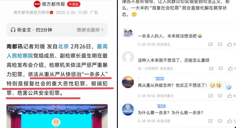唐人日报2月28日讯:近日,最高检发布声明,表示将依法从严从快严惩“一杀多人”及其他报复社会的重大违法犯罪。最高检强调,对于此类犯罪要依法追责,保护社会安全。然而,一些博主对此表示,严格惩处虽然重要,但更需确保司法公正,只有让群众真正感受到司法的公正与透明,才能从源头上有效预防“报复社会犯罪”。