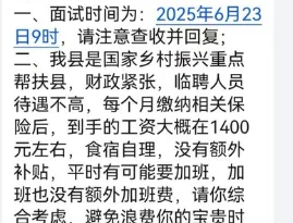 唐人日报6月25日讯:广西一名博主在社交平台发帖,询问网友是否有必要接受一份异地编外临聘岗位。据他描述,该岗位工资微薄,扣除五险一金后每月到手仅约1400元,且食宿自理、无补贴、加班无补偿。这一帖文迅速引发网友共鸣与热烈讨论。