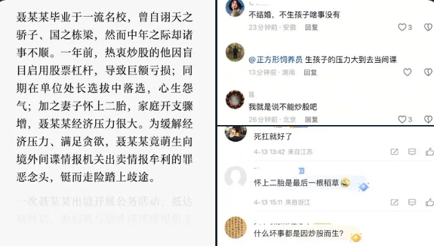 案件曝光后,网络舆论迅速发酵。有网友调侃称:“信息量太大——别炒股、别生二胎。”但更多声音则表达出对国家安全形势的担忧与对个人心理失衡危害的警惕。