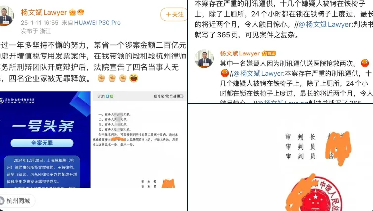 唐人日报1月28日讯:近日,杭州律师杨文斌发文称,某省一宗涉案金额高达200亿元的虚开增值税发票案件,在其团队辩护下,法院最终宣告四名企业家无罪释放。杨文斌透露,本案中存在严重的刑讯逼供问题,部分嫌疑人遭受极端暴力对待,其中一名嫌疑人因刑讯被送医抢救两次,十几名嫌疑人被24小时拷在椅子上。