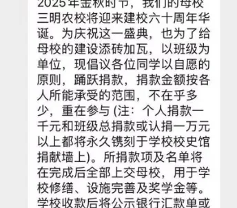 唐人日报9月15日讯:福建省三明市农业学校近日为庆祝建校60周年,向全体在校学生发出“爱校捐款倡议”,引发社会关注。学校在最初的通知中强调“师生共同为校庆贡献力量”,并提供了具体的捐款方式和金额参考。然而,消息一经传播,迅速引发舆论质疑:学生群体大多尚未具备稳定经济来源,学校是否在变相向学生“摊派”费用?