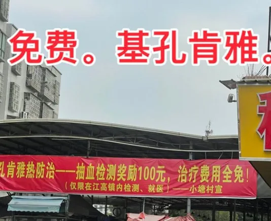 唐人日报10月31日讯:广东广州市白云区江高镇小塘村,一条鲜红的宣传横幅在街头引发关注。横幅上写着:“基孔肯亚热防治,抽血检测奖励100元,治疗费全免(仅限在江高镇内检测就医)——小塘村宣。”标语信息直白醒目,却也让不少市民感到疑惑与不安。