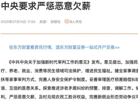 唐人日报7月16日讯:《中共中央关于加强新时代审判工作的意见》正式发布,明确提出要“依法维护平等就业和劳动权利”,对恶意欠薪行为实行严厉惩处。这一表态无疑释放出中央对打击拖欠工资问题的强硬信号。