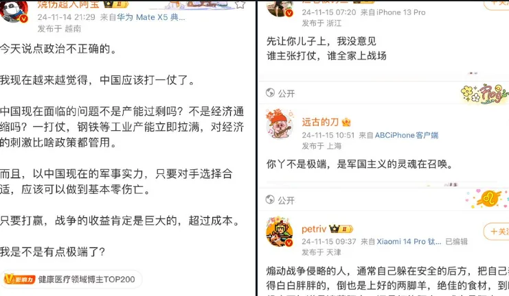 唐人日报11月16日讯:近日,知名“正能量博主阿宝”发文称:我觉得中国应该打一仗,只要打一仗就能解决中国产能过剩和通缩的问题,一旦打起来,钢铁等工业立即拉满,并且以中国的实力,肯定会越打越有钱。“我是不是有点极端了?” 其他博主回复:这不是极端,这是军国主义灵魂在召唤。